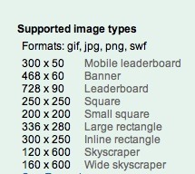 Anyway, I decided to give adwords a go. Once you sign up for the service, you can choose between a text ad or an image ad. If you choose an image ad, you need to create the ad in one of these standard sizes.