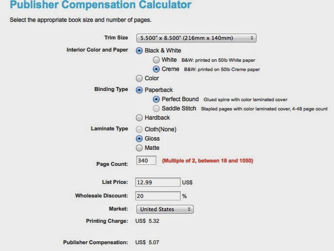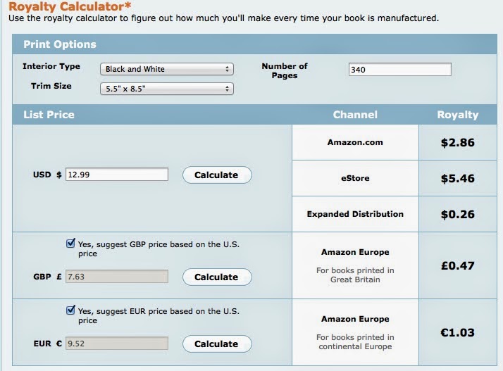 As the owner of Carpe Luna publishing, I started with using Createspace only but soon was selling enough via expanded distribution to notice the disparity in royalties between Createspace to Amazon and Createspace to all other channels. To illustrate, let's take a book priced at $12.99, 340 pages, Black and white with Cream interior. Here's the royalty breakdown at Createspace.