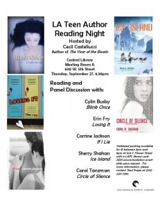 Join me for the Los Angeles Public Library Teen Reads Series with other YA authors, including Cylin Busby, Sherry Shahan, Erin Fry, and Carol Tanzman. Details here.