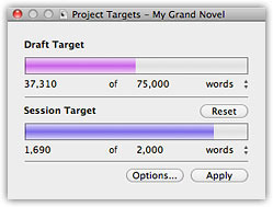 I know Word has that a total word count you can track at the bottom left corner of the screen. Scrivener does more. You can track scene and chapter word counts. Better yet, you can set daily word count goals within Project Targets. LOVE this. And, if you like to track which chapters you've edited, finished writing, etc., you can also do this in Scrivener. At a glance, I can see where I left off the last time I was working.