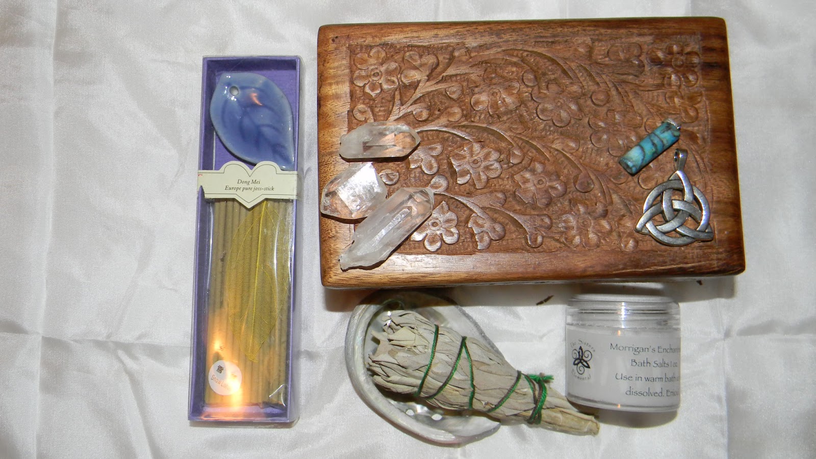 Morrigan Prize Pack consisting of a wooden jewelry box, incense set with