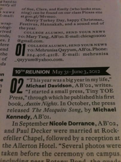 Once again, the release party will be at the Medici, on the mezzanine level. The Med is located at 1327 e. 57th street in Chicago. The party is on Tuesday November 1st, from 7 o' clock in the evening till 9.