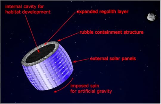…наши результаты показывают, что базовая физика преобразования небольших астероидов в среду обитания человека осуществима. Кроме того, наше предложение, вероятно, будет менее затратным и сложным с точки зрения инженерии, чем строительство классической среды О'Нила, в которой все конструкционные материалы должны быть изготовлены и доставлены на строительную орбиту