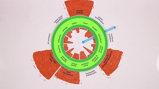 …Откуда взялась эта одержимость ростом? ВВП — валовый внутренний продукт — это всего лишь общая стоимость товаров и услуг, проданных в стране за год. Его придумали в 1930-х годах, но вскоре он стал главной целью всякой политики, настолько важной, что по сей день в богатейших странах в правительствах считают, что решить их экономические проблемы может дальнейший рост. […] позвольте познакомить вас с «пончиком», который может оказаться полезным для нас. Представьте, что ресурсы человечества исходят из его середины. Эта дыра посредине — место, где людям не хватает жизненно необходимого. У них нет еды, медицины, образования, политических прав, жилья — того, что нужно каждому для достойной жизни и реализации возможностей. Мы хотим вытащить всех людей из этой дыры через социальное основание в зеленую часть пончика. Но, и это важное «но», нельзя, чтобы совокупное использование ресурсов вышло за внешний круг — экологический потолок, потому что иначе мы будем слишком давить на нашу невероятную планету и выведем её из равновесия. Из-за нас меняется климат, закисляются океаны, появляются озоновые дыры, мы выходим за пределы возможностей нашей планеты, ее систем, поддерживающих жизнь, благодаря которым за последние 11 000 лет Земля стала такой гостеприимной к человечеству.