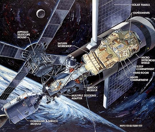 "В 1963 году ВВС США предложили разрабатывавшийся некоторое время, но так и не осуществлённый проект военной разведывательной станции Manned Orbiting Laboratory (MOL) на основе верхней ступени ракеты «Аджена». Примерно в то же время фон Брауном была представлена концепция «Практического применения программы „Аполлон“», где среди прочего предполагалось использовать верхнюю ступень ракеты Сатурн 1B в качестве жилого объёма орбитальной станции. Фактически станция выступала в двух ипостасях — сначала выводила себя на орбиту как ракетная ступень, затем освободившийся бак жидкого водорода дооснащался, и ступень превращалась в орбитальную станцию."