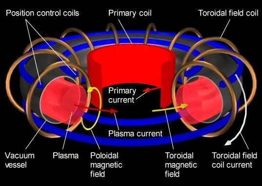 Параллельно в СССР и Англии, а затем и в ряде других стран, начинаются эксперименты с токамаками – с тороидальными камерами, имеющими форму бублика, с магнитными катушками. В токамаках создаются два мощных магнитных поля, при суммарном воздействии которых плазма сжимается в жгут в центральной части тора.
