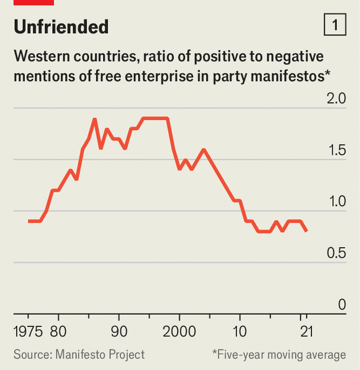 Иллюстрация к тренду: Долгосрочная тенденция очевидна. The Economist, используя данные исследовательской группы Manifesto Project, изучил соотношение благоприятных и неблагоприятных дискуссий о свободном предпринимательстве в манифестах политических партий в 35 западных странах с 1975 по 2021 год, самый последний доступный год (см. диаграмму).