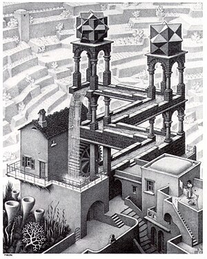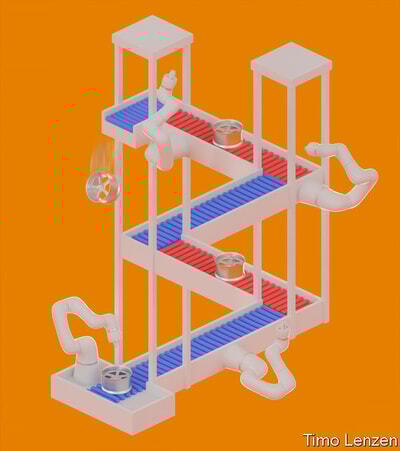 Но есть нюанс - который отражен в иллюстрации к статье. Это скетч Тимо Ленцена, перекликающийся с литографией Эшера "Водопад" (1961), и с описанием абсурдной круговой фабрики с производством изделий ради их утилизации путем переработки в такие же изделия, ради их утилизации... - из НФ-романа Лема "Эдем" (1958).
