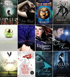 Giving Away:-- Virals by Kathy Reichs (hardcover)-- The Iron Witch by Karen Mahoney (paperback)-- Relic Master: The Dark City by Catherine Fisher (ARC)-- Hush, Hush by Becca Fitzpatrick (hardcover)-- Matched by Ally Condie (hardcover)-- Swoon by Nina Malkin (paperback)-- Elphame's Choice by PC Cast (paperback)-- Claire de Lune by Christine Johnson (hardcover)-- Pegasus by Robin McKinley (hardcover)-- Red Riding Hood by Sarah Blakly-Cartwright (movie novel, paperback)-- Sea Change by Aimee Friedman (hardcover)-- Fallen by Lauren Kate (hardcover)