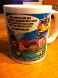 Again, in typical Cathy style, she had these fabulous mugs created. You can see the pics match the header on her blog. You probably can't read the text, it's just as well. Ha – just kidding. It says "Pierre Berton once said, 'A Canadian is someone who knows how to make love in a canoe.' Isn't that romantic, Dave? OK, who farted?" (a little TMI, Cathy