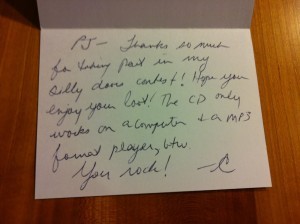 And the sweetest bit was this note from Cathy. It was my pleasure taking part in your contest, Cathy.