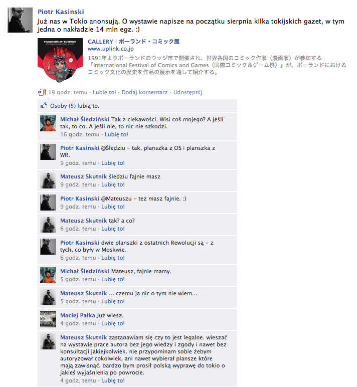 Komiks w Polsce. Takie kolorowe lub nie obrazki z tekstem lub bez. Pierwszy z kultury do bicia w mediach (tzw. afera chopingate), pierwszy do czarnej roboty na froncie polityki historycznej, pierwszy do robienia w wała (polecam notkę Marka Turka), ostatni w kolejce do splendorów (Europejski Kongres Kultury) ale znów pierwszy do promocji polskiej, młodej kultury za granicami, dzięki wystawom przekrojowym. Ostatnia z nich, w tokijskiej galerii Uplink do obejrzenia od 3. sierpnia.