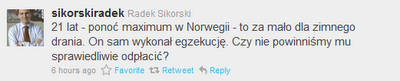 Piękna szarża, prawda, bo czegóż my tu nie mamy? Wyrażenie ubolewania z powodu niedostatków systemu prawnego suwerennego, pogrążonego w żałobie, demokratycznego kraju (oczywiście, z chęcią służymy naszym [systemem]). Tęsknotę za barbarzyńskim zwyczajem kary śmierci, niezbyt chytrze ukrytą w retorycznym zapytaniu. Ot, esencja wąsatego polocentryzmu w wykonaniu człowieka, który, zważając na piastowane stanowisko, powinien sto razy zastanowić się zanim cokolwiek powie i napisze o czymkolwiek, co stało się na tej planecie.Double facepalm to za mało w tym przypadku.