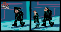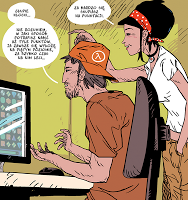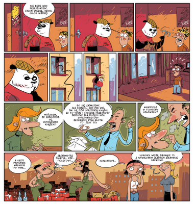 3. Na Jedno Pub to nowa seria, którą razem z KRLem robimy dla warszawskiego magazynu SOUL (coś im muszę powiedzieć na temat muzy, odpalanej z partyzanta na stronie, also: gdzie się tę inwazyjność wyłącza - czujcie się ostrzeżeni). Serię wymyśliłem ja, ale to Karol jest odpowiedzialny za story poszczególnych odcinków (jak i szkic). Ja tylko redaguję dialogi, kładę tusz, składam to wszystko do kupy, koloruję i literuję. Magazyn jest gratis, nie mam pojęcia, gdzie można go znaleźć (patrz tu) a nasz pasek (leci przez cały mag, niemal 16 stripów na numer!) to jedyna rzecz, jaką warto w nim przeczytać.