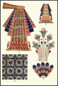 But in 1804, images reached England of the Egyptian and Etruscan gifts Napoleon had brought back from the Nile campaign to France for his wife, Empress Joséphine, a noted fashion leader. Overnight, the Grecian look vanished and Egypt was hot. Still geometric in design, the new needlework sported fan spreads, greater detailing, and slightly larger designs, as well as tassels on shawl corners.