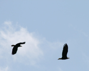 “Nope. Those are eagles.” He shaded his eyes with one hand. “Looks like bald eagles.”