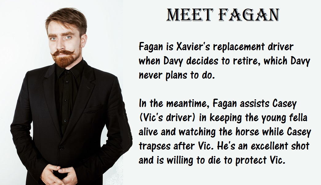 Xavier hired Fagan after Tubs took three shots in the chest. Had he hired Vic more protection earlier, Fagan could have carried the poisoned woman from the house while Tubs eliminated the trouble. Unfortunately, Tubs had to drop the woman he carried and knock Vic to safety, by which time he’d taken three shots to the chest. So Xavier is taking no more chances. Vic has two well-armed strong young men watching her now. Casey can handle a carriage at speeds beyond anyone he’s ever seen and Fagan can shoot the eye of a crow a thousand feet away.