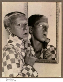 These works clearly explore experimental territory similar to the photographs of Man Ray and Lee Miller, who used photographic technology to reframe, dissect, and erotically defamiliarize the female body. Techniques such as the disembodied head-in-a-bell-jar trick appear in both Miller’s and Cahun’s work: in Cahun’s version, however, the sequence is used to highlight the theatrical expressiveness of the face. Showcasing her experience on the stage, these isolated heads are absurd Beckettian characters, rather than objects or collectibles. Viewed as a whole, her body of self-portraits forms an exegesis on the performance of self, which probes the nature of the dissected identity rather than the body. Cahun’s repeated use of mirrors, reflections, and masks pay tribute to the photographic medium while providing symbolic resonance for the themes of masquerade, questioning the source and privilege of the gaze within the performative space of the portrait.