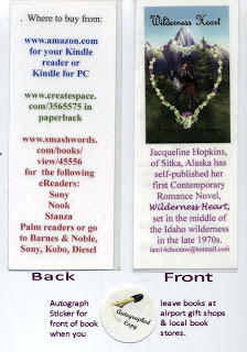 Bookmarker I made this bookmark to give with the paperback version of my book, Wilderness Heart. I used Microsoft Publisher to design the layout. The front I did by using the front cover my book and then said who I was, where I lived, name of book and a tiny bit about it, and my email address. I did this layout 8 times to print out 8 bookmarkers on an 8.5"x11" good quality paper. For the back side, I put all the places it can be purchased (at the time I designed the bookmark, though it can be purchased from more places now) for all ereaders and paperback. I take them to the local business supply store to be laminated.