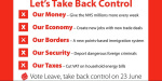 In seeking to unravel and understand why so many people accepted these half-truths and mis-representations, I have categorized some of the images used in the Vote Leave Twitter campaign (https://twitter.com/vote_leave) into the following themes, many of which undoubtedly intersect, thus reinforcing each other. I hope this encourages debate and discussion over the reasons why the UK has embarked on this desperately uninformed and misguided foray into apparent “independence” as its citizens sleepwalk into a Brexit catastrophe.