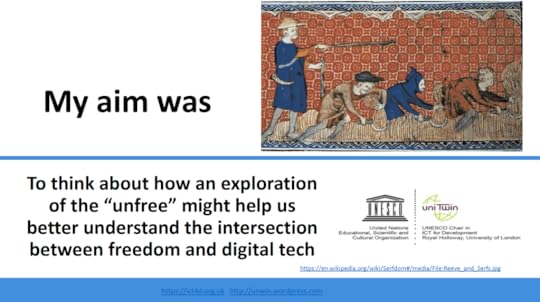 Digital addictionWe are the dataGovernments enforcing use of digital systems for government servicesLabour exploitation (through extending the working week)Digital poverty and educationDigital tech contributing to modern slaveryTime precluded the inclusion of several other forms of enslavement that I might have considered. Drawing on my medievalist backgroung, I was especially interested in the role and interests of the Digital Barons.