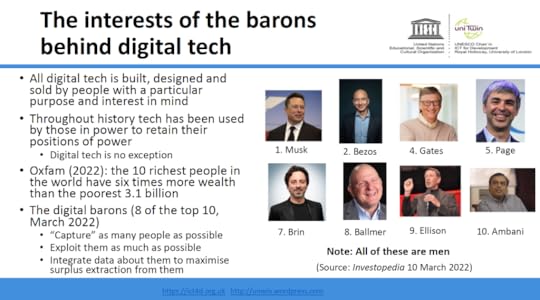 Prolegomena on Human Rights and ResponsibilitiesThe advantages of being unconnected to the Internet: a thought experiment Reclaiming ICT4DI also made it clear that appropriately designed digital tech can be used to great advantage by poor and marginalised communities, although given the theme of the confernce I concentrated exclusively on “digital enslavement” and the role of the “digital barons”.