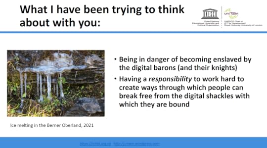 First, that many of those developing digital technologies and indeed in the biotech sector more widely are working hard to extend human life through digital tech. The work of Calico (subsidiary of Alphabet, Google’s parent company) and Elon Musk’s creation of Neuralink are just two examples (claiming that “that people would need to become cyborgs to be relevant in an artificial intelligence age. He said that a “merger of biological intelligence and machine intelligence” would be necessary to ensure we stay economically valuable”, Guardian , 2017). More widely, the increasing blending of human and digital makes me think that within a relatively short period of time, perhaps already, it will not be possible for “pure humans” to survive, in a world increasingly dominated by cyborgs. For many this does not matter; for others (including me) it does. We need to think such thoughts so that we can debate them openly, thereby enabling people to reach wise judgements as to the kinds of future “we” wish to create. This in turn of course depends on who “we” are, and here I would err on the side of relativism and diversity. I find one single universal “we” frightening; just as I do the idea of universal individual human rights, without the balancing necessary responsibilities to ensure that diverse individuals can live side-by-side (see Unwin, 2014).The second idea I would like to share is that digital technologies are becoming increasingly harmful to life (of all kinds) on planet earth. We need to understand the negatives of technology on nature/earth/the physical environment, as well as the positive potential of its use. This is obviously important in the context of the upcoming COP26 jamboree. Although much effort has been expended on trying to show how digital tech is squeeky-green-clean and can contribute much to a reduction in CO2 and thus “save the planet from climate change”, the truth is much dirtier. Increasing research shows just how anti-sustainable many digital techs are: fast fashion business models (smart-phone life/owned span around a couple of years); companies preventing right to repair; environmentally harmful mining of rare-earth minerals; bitcoin using more energy than Argentina or the Netherlands; satellite pollution of outer space (akin to the way we used to treat the oceans); digital tech creating twice as much carbon emissions as the airline industry; and energy demand spiralling upwards as 5G, AI, smart cities and a world of sensors come to dominate our lives. The Digital-Environment System Coalition (DESC) that I founded earlier this year, and to which anyone is most welcome to join, is committed to rethinking the relationships between digital tech and the life of nature, focusing on both the benefits and the harms that it can be used to create.