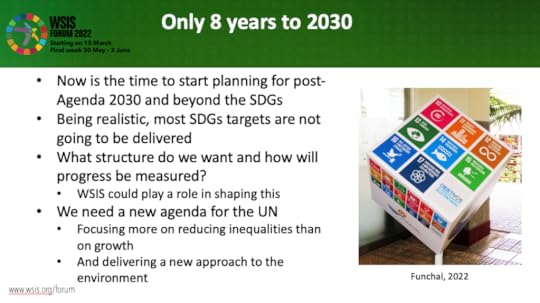 My main argument was that with only eight years to go, it is essential that we start planning now for what will replace the SDGs, especially with respect to the uses of digital tech.