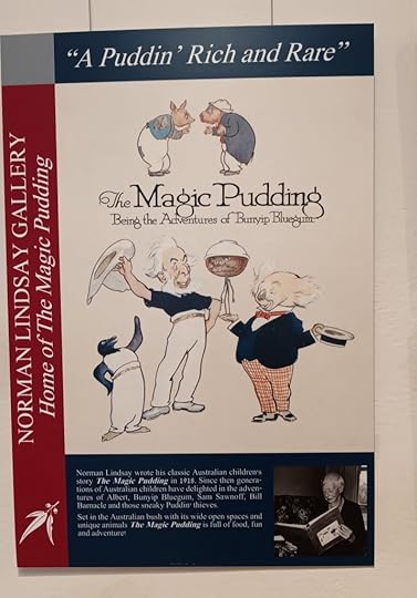 Book Cover of The Magic Pudding by Norman LindsayHe first entered my life as the creator of ‘The Magic Pudding’ a book which came into my hands when I was about 8. I loved it and read it over and over again. It gave me my first concept of Australia and of Australian people. I thought all Aussies were like the characters in ‘The Magic Pudding’ – Bunyip Bluegum and his companions Uncle Wattleberry and Sam Sawnoff, not to mention the very rude and outspoken Pudding himself on his spindly legs!