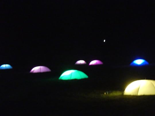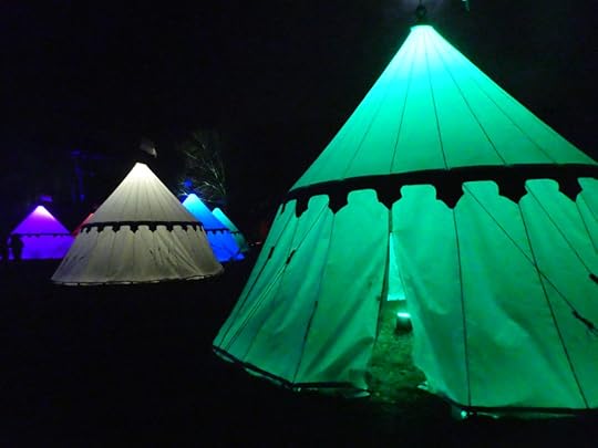 There we passed numerous brightly coloured illuminated tents; and then a field of what looked like giant luminous fungi – in reality multi coloured open umbrellas on the grass.