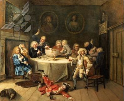 William Hogarth painting: ‘A Midnight Modern Conversation’In another room we were invited to contemplate the aftermath of the scene in Hogarth’s painting, ‘A Midnight Modern Conversation‘, a reproduction of which hung above the fireplace. In this painting, a group of men are carousing round the table, and one of them has fallen on the floor, drunk. In Dennis Severs’ re-imagined scene everything was re-created in detail, as if the disorderly drinkers had just lurched out of the room and left the scene; amongst many other elements, I saw a pie on a side table discarded and surrounded by crumbs, and a general sense of disarray clung to the room.