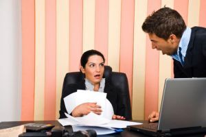 Overwhelmed secretary being bawled out by an impatient boss in an office