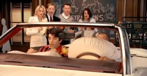 After a man wearing a Hawaiian shirt jumps into the car and starts dancing in his seat, the car (not unsurprisingly) crashes.
