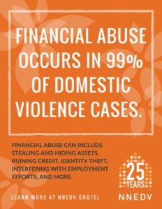 Abuse comes in many different forms leading to different consequences and reactions. Abuse ultimately is always about power and control. The partners’ goal is to maintain power in the relationship and figure out how to control the other person. Financial abuse is one of the ways an abuser gains control of the situation. Financial abuse occurs when one intimate partner has control over the other partner’s access to economic resources, such as their source of income, credit cards, etc. This form of abuse is often prevalent and very subtle. The partner slowly works their control over the victim to take control of all possessions. When women or men leave a relationship, most people don’t have much beyond what is on their back or in their purse. The first time I left I had more possessions however it was due to the safety plan I had created with a friend.