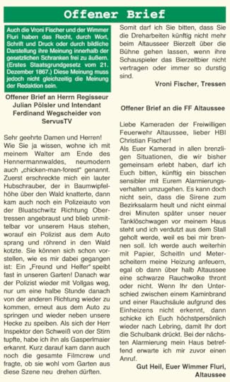 Die Alpenpost, ein Regionalmedium des Ausseerlandes, enthält um diese Jahreszeit auch immer eine Faschingsausgabe. Diesmal widmet sich einer der Leserinnenbriefe in dieser Ausgabe den Dreharbeiten zu „Letzter Saibling“: