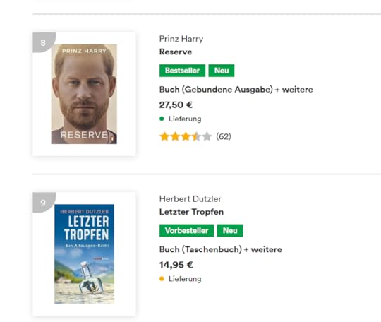 Total unglaublich – aber Realität. Zwei Wochen vor der Auslieferung in die Buchhandlungen liegt „Letzter Tropfen“ bei Thalia bereits auf Platz 9 der Bestsellerliste. Knapp hinter dem weinerlichen Prinzen Harry.