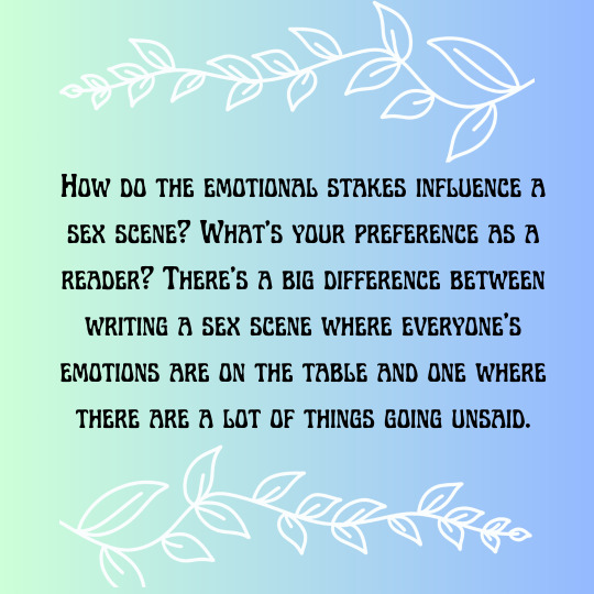 Something I personally also like doing, which I think lends at least a little realism to fictional sex scenes, is to include the stuff that doesn’t work. Like when someone’s leg gets pushed up too far and their hamstrings can’t take the stretch, or when a cramp happens, or when the characters’ skin sticks together and it hurts when they pull apart. Little things, not enough to take you out of the scene, but enough to ground the reader in the idea that these are real bodies doing a real thing that isn’t always super easy or dignified.