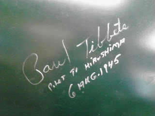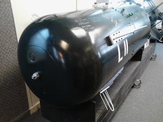 Inside the very nicely-put-together museum, you can see a replica of "Little Boy," the bomb dropped on Hiroshima by the Enola Gay. It is astonishing to see how very small a device it is, to have wrought so much destruction. The replica shows signatures from the flight crew, including Col. Paul Tibbets, who was the pilot.