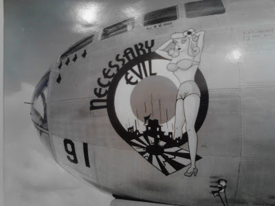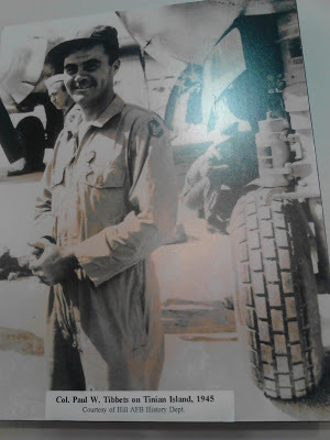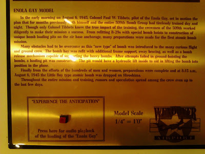 The museum features an audio of the Enola Gay being loaded on that fatal day, Aug. 6, 1945. You press a button and hear the busy airfield readying itself for the flight, the bomb being loaded, men talking, calling out to each other. I got a distinct chill listening to it, and listened to the brief clip several times. At the end, there's a little burst of jazz music and a woman singing--did someone turn on a radio? I was trying to imagine that day and how the men felt. Apparently, the true mission of the Enola Gay was kept quiet to all but Col. Tibbets until the plane was actually underway, but you have to wonder...