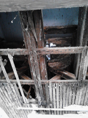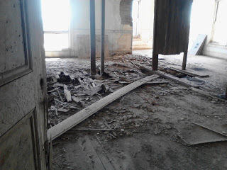 Ceiling showing light from floor above: not sure what roomIn the schoolroom, I noticed slung netting covering portions of the ceiling. In that netting were some pretty big chunks of ceiling plaster. I'm glad the net was there to protect our heads. It wasn't until we exited the structure via the boys' dining hall that I looked back and saw this above the door: