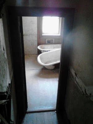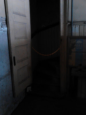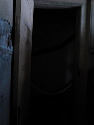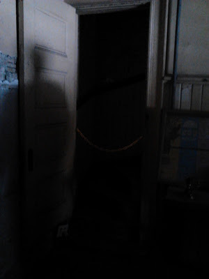 So here's what's wierd. I tried to photograph the staircase she was pulled from. I couldn't. My cell phone's screen was black. I thought for a second the phone had turned off. I kept trying to get a picture of it, but blackness seemed to be seeping, exuding from the stairs. The best I could do was to capture the door frame of its entry. After the tour moved on, I remained, thinking that I could get a picture now that no one was standing in front of the room's window blocking the light. No. Still no light to illuminate that photograph. Here are my three tries: