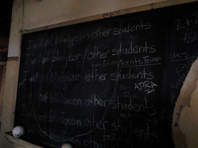 "I will not bludgeon other students"Also in the cellar was the schoolroom. The chalkboard displayed more macabre humor.
