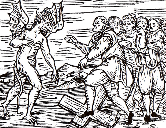 Credit: Brian Levack: The Witch Hunt in Early Modern Europe (Longman 1987)A demon encourages witches –including men—to trample the cross, depicted in the 1610 book Compendium Maleficarum, by an Italian monk.