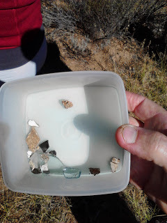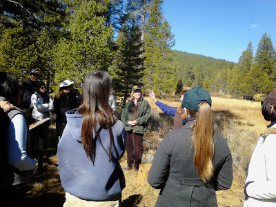 Guide Carrie Smith holds up a tiny piece of bone found at Alder CreekThere has been a lot of archeology in the meadow. Our guides told us that a hearth was located: of course, nothing so blatant as a circle of stones, but instead an accumulation of orange dirt that indicated long-term fire that changed the composition of the soil (I'm only halfway through An Archeology of Desperation or I'd probably be able to write something smarter). Long-term fire is key: the Donners were here for four months, but many others have trooped through the area and built their fires. The discovery of the hearth almost certainly means one of the Donner sites was found: but which one? The site is not labeled and that's intentional. After a century and a half of people disturbing the site in their quest for Donner money or Donner relics, they want to protect it. An object, once taken from its original resting place, is of no use to an archeologist; it must remain in situ.