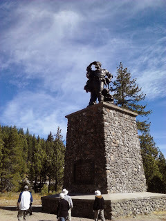 Pioneer MonumentFamously, the base of the statue is 22 feet, the snowfall the winter of 1846. Lots of people dispute that number, saying it was the accrued snowfall that melted and refell--that at no time would 22 feet of snow stand. But check out this factoid from Truckee's wikipedia entry: "The maximum 24-hour snowfall was 34.0 inches (86.4 cm) on February 17, 1990." Unfortunately, there were no meterologists monitoring things at Donner Lake that year, but we have reports of unrelenting snowfall from Breen's extant diary.Here's a close-up of the plaque on the monument. I cannot believe it mentions virility, since it was the men who made the disastrous decision to take the fatal Hasting's Cut-off, while poor Tamsen Donner clearly advocated staying on the proven trail. A fellow traveller's journal reports her sour disposition as the men overruled her.