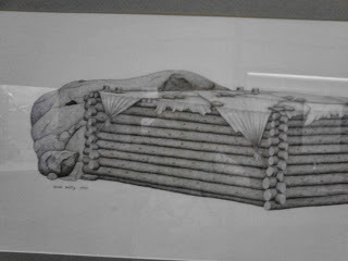 Here's a drawing of the Schallenberg cabin as it might've appeared when the emigrants first arrived, before it dawned on them that they weren't going over that mountain range anytime soon...