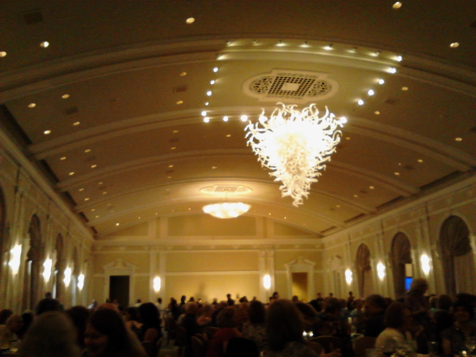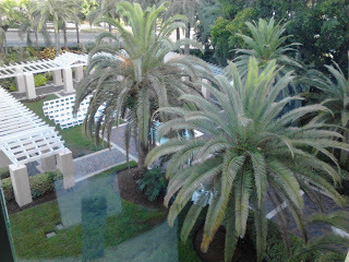 A room with a view: Helena Bonham Carter, eat your heart out!I had two windows with lovely views that really underscored I was in Florida. Palm trees! It's hard to tell, but the aqua square is a lovely fountain, and the white chairs are all set up for the wedding whose dance party would be later overtaken by bookish drunks on a tear. I kept looking at this picture, wondering what the odd pale business card looking thing is, with the blue stripe hanging down, towards the left of center. I just figured it out: it's my necklace thing, what's it called? That you wear around your neck so you can get into the conference? And the blue dangler said "Speaker" on it. It had flipped around backward to be immortalized in the window reflection.I think that's all for the Vinoy. In my next post, I'll share images of some of the sessions I attended.