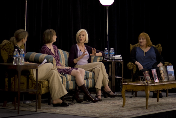 From left, moderator Michelle Gagnon, me (how I miss those boots), Kathleen Kent, and Brunonia Barry. Photo courtesy of Secret Sushi, Flickr.