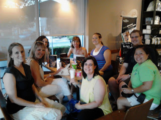 Adjourned for coffee afterwards with friendsAfterwards some of us walked a block away to Starbucks (I love Town Center). I made everyone display their books on the table...and poor Susan had to sit on the floor. Not pictured are two other sweethearts who came: Diana and Heidi.