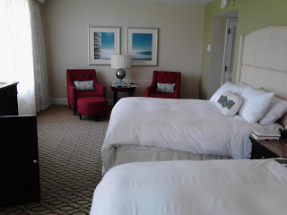 View from other side of the room. Love the lime walls with magenta chairs.The room was gorgeous and I contemplated sleeping on each bed on alternate nights. Instead, I stuck with the one by the door so I'd be aware and ready when Jack Torrance came with the ax. Actually, the Vinoy is reputed to be haunted. When I made my reservation, I specifically asked for a room that was not haunted. The woman laughed and said, But we need fresh souls from California.